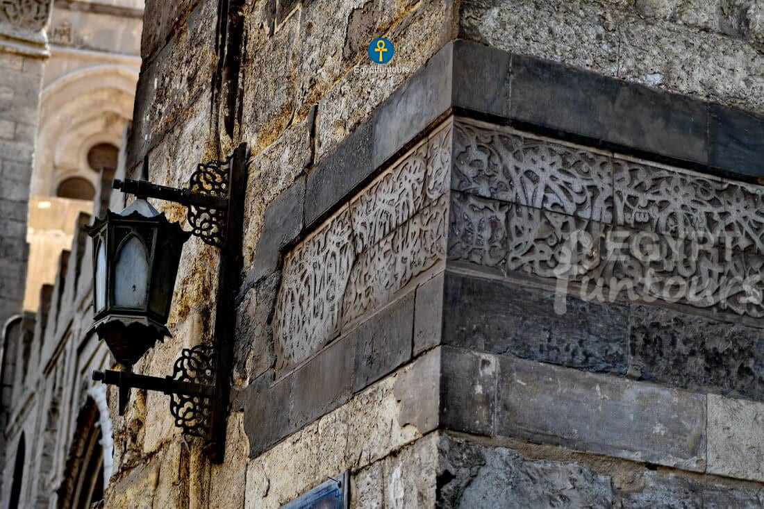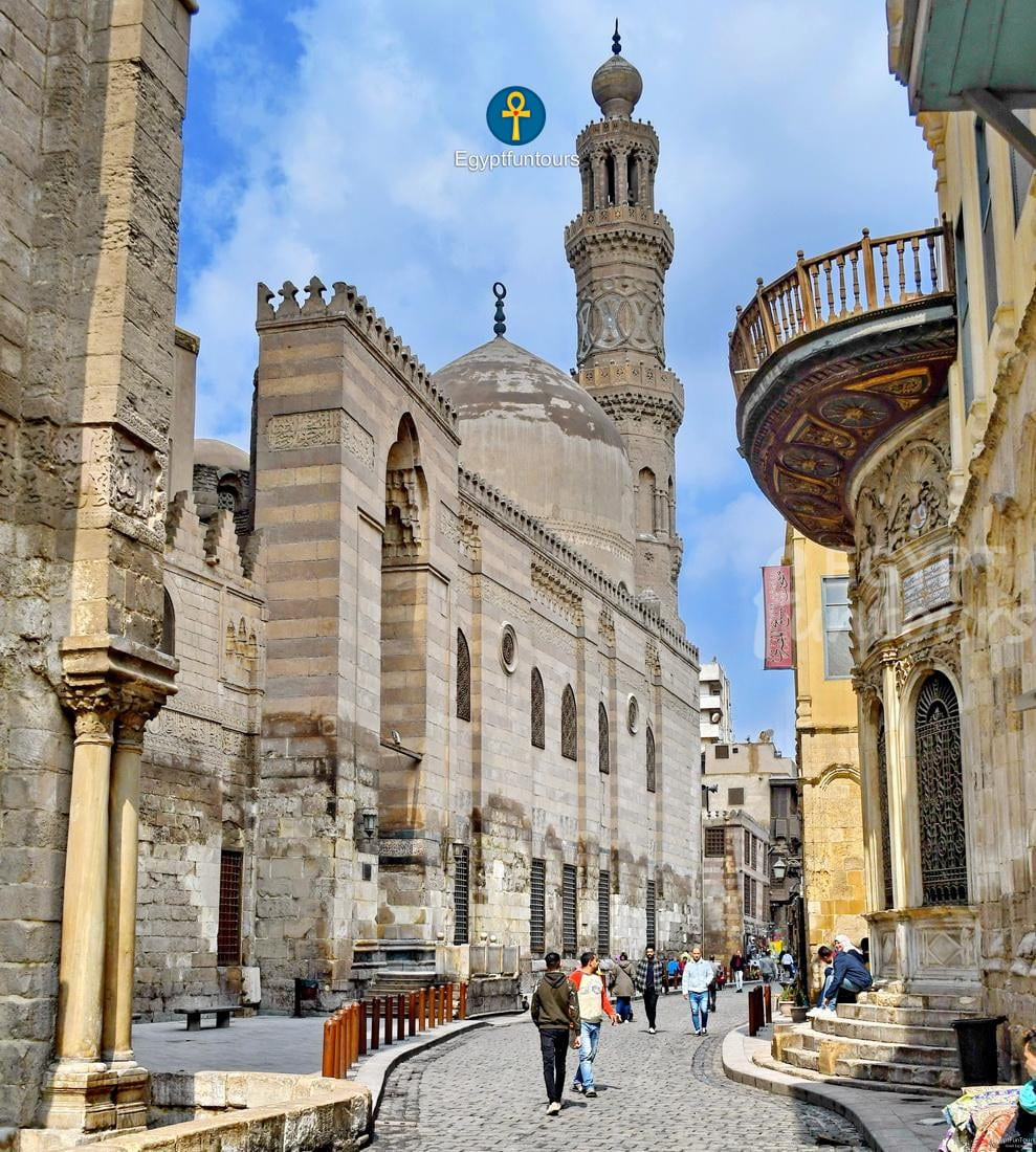 Sultan Al Mansur Qalawun built the Sultan Qalawun complex in 1284. It is one of the most well-known historical structures on Shari El-Muizz Boulevard. Within its boundaries, you will find a mosque, a medersa, a mausoleum, and a mauristan. In the 1920s, they demolished the mauristan and replaced it with a modern hospital. The structure reflects the style of the Mamluks of that period. The external windows of the entire complex show Gothic architectural influences, which Sultan Qalawun became familiar with from Crusader cathedrals.