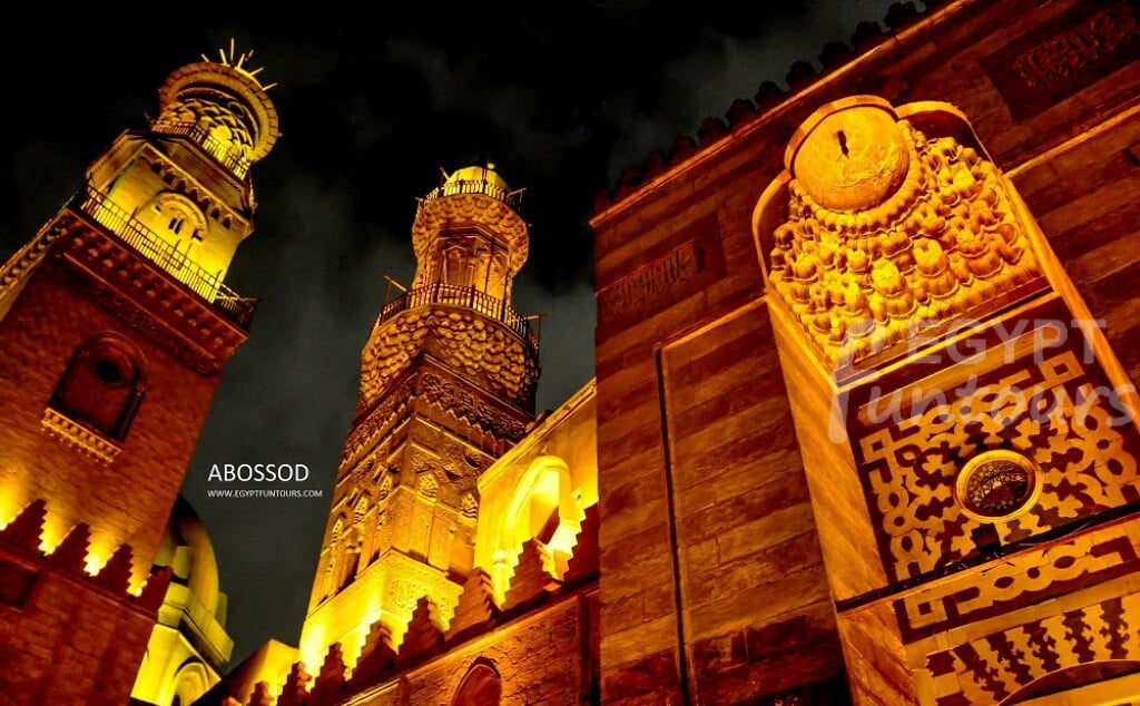 This mosque is in the early part of Al-Mo’ez Street, near Bab al-Futuh. Al-Hakim Bi-Amr Allah, a notoriously bizarre caliph, commissioned its construction in 990 AD. The sanctuary’s most impressive features are its minarets. They are the oldest surviving minarets in Cairo. The mosque’s remarkable entrance resembles a propylon, an ancient Egyptian structural feature.