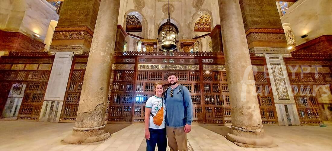This mosque is on Al Moez Street, between Al Kamilyia School and the Nasser Mohammed Mosque. Al-Zaher Abu Said Barqouq designed it with a central courtyard surrounded by four iwans in the orthodontic school system style. Engineer Ibn Al-Tulun designed and coordinated the project, decorating it with incredible engravings.